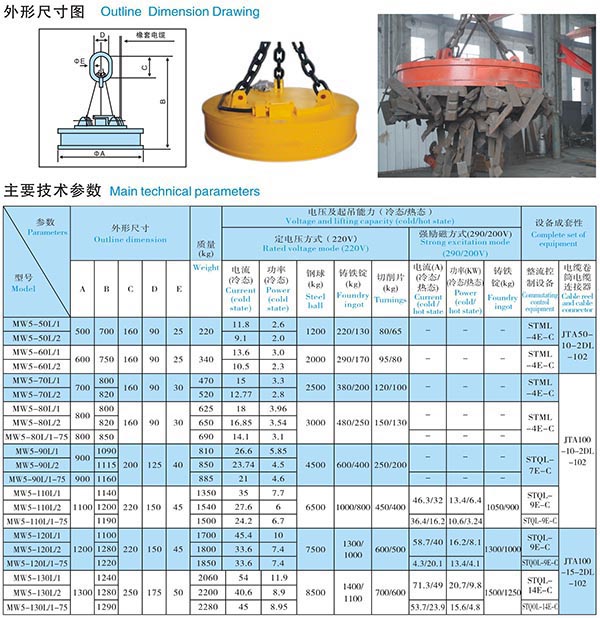 1、本系列用于吸吊鑄鐵錠、鋼球、生鐵礦、機加切削;鑄造廠的各種雜鐵、回爐料、切料頭;打包廢鋼等;在煉鋼爐渣處理工藝中,用于先期除去大型鐵件;在洗煤廠吊運鐵粉等。雙室式出線盒,特設超厚出線盒保護板,引出電纜防扭設置。 MW5系列起重電磁鐵有標準型、高溫型和高頻型。