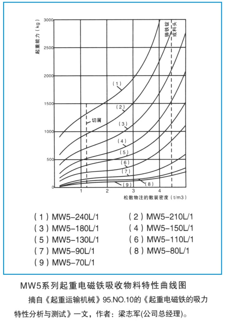 4、對不同密度的磁性材料,請按右圖“MW5系列起重電磁鐵吸收物料特性曲線圖”選取MW5系列起重電磁鐵。
