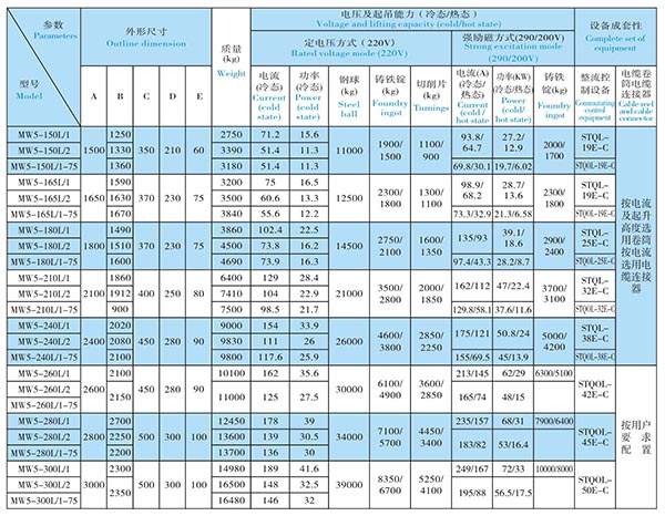 2、MW5系列標準型和高溫型起重電磁鐵,通常采用定電壓控制方式,也可采用強勵磁或過勵磁控制方式,通電持續率一般為TD60%。其中MW5系列高溫型起重電磁鐵采用了特殊的耐熱措施,可吊運700℃以下的廢鋼等。 MW5系列高頻型起重電磁鐵一般采用強勵磁或過勵磁控制方式,通電持續率TD75%,可采用強勵磁方式(DC-290V/200V)可提高吊運能力約 6%,大型的可采用過勵磁(DC350V/290V/200V),可加快電磁鐵的勵磁速度,可提高吊運能力約12%。